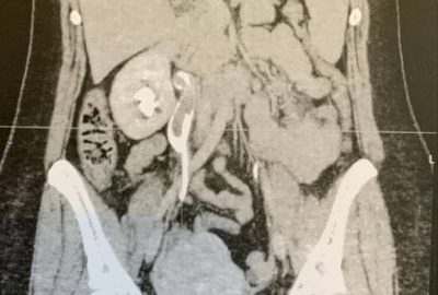 Μετά την κλινική εξέταση ακολούθησε Αξονική τομογραφία η οποία έδειξε λιθίαση του κάτω τριτημορίου (ΑΡ) ουρητήρα με ουρητηρουδρονεφρωση.